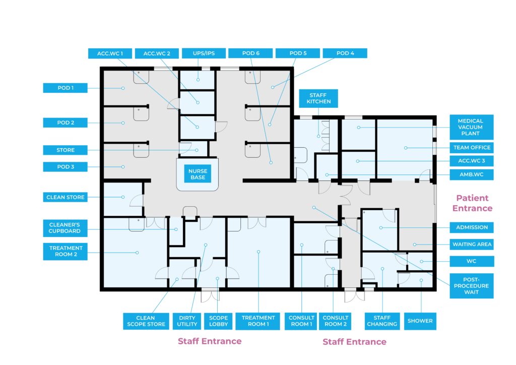 Ved hjælp af moderne byggemetoder vil Vanguard bygge et lokalt diagnostisk center med to endoskopibehandlingsrum og seks patientkapsler, hvor patienterne vil blive forberedt og efter behandling komme sig. Andre rum omfatter reception og administrationsområde, venteområde, modtagelsesrum, to konsultationsrum, sygeplejerskestation, opbevaringsområder, bryggerser og skopopbevaring samt personalets velfærdsrum og køkken.