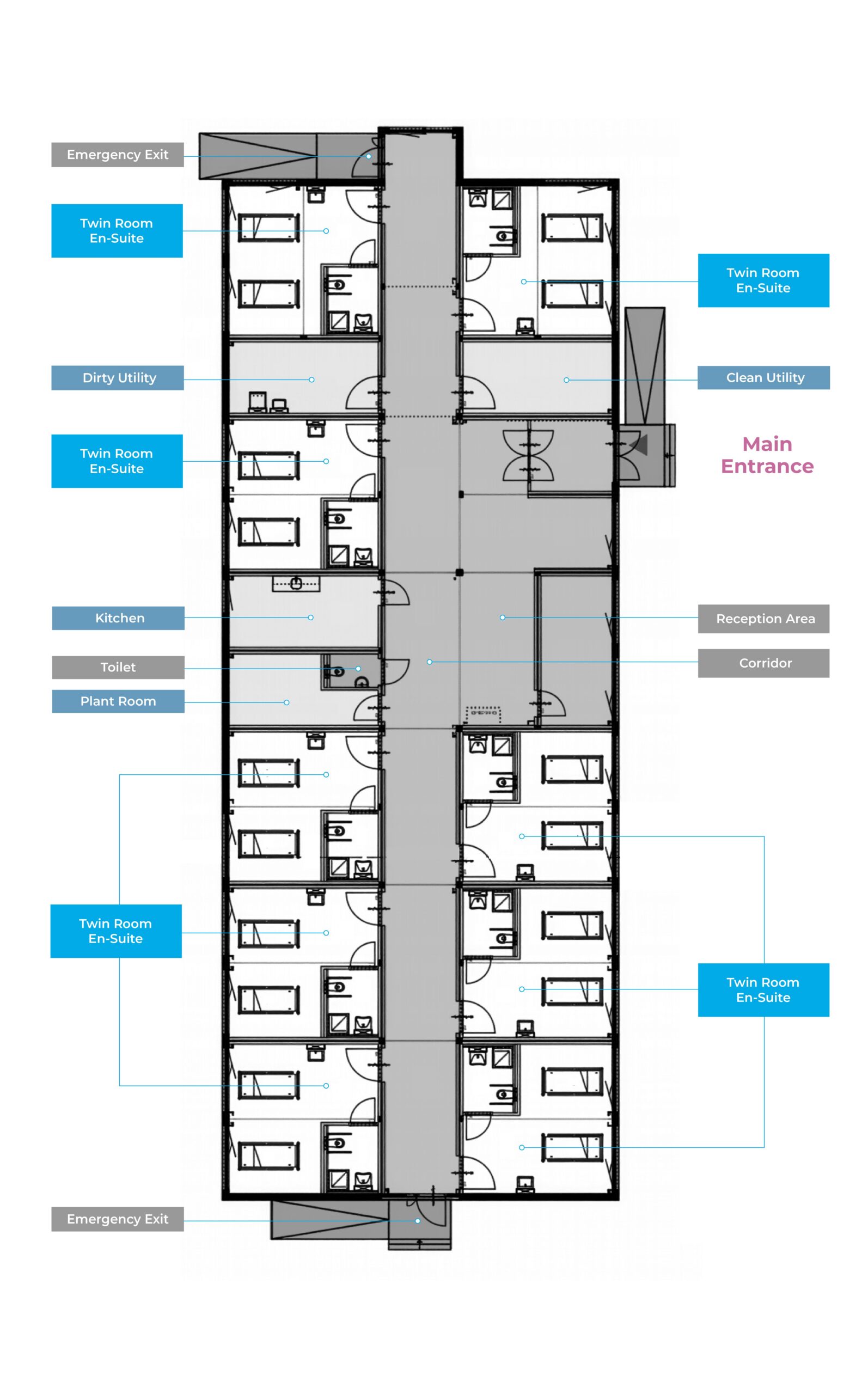 L'edificio si estende su 600 mq e dispone di nove camere doppie, ciascuna con bagno privato. Sono inoltre presenti locali di servizio, spazi di stoccaggio e una postazione infermieristica in reparto. La configurazione interna è stata progettata per garantire un flusso efficiente dei pazienti, massimizzando l'utilizzo dello spazio disponibile e garantendo il trasferimento pratico e sicuro dei pazienti in arrivo dall'edificio principale dell'ospedale.